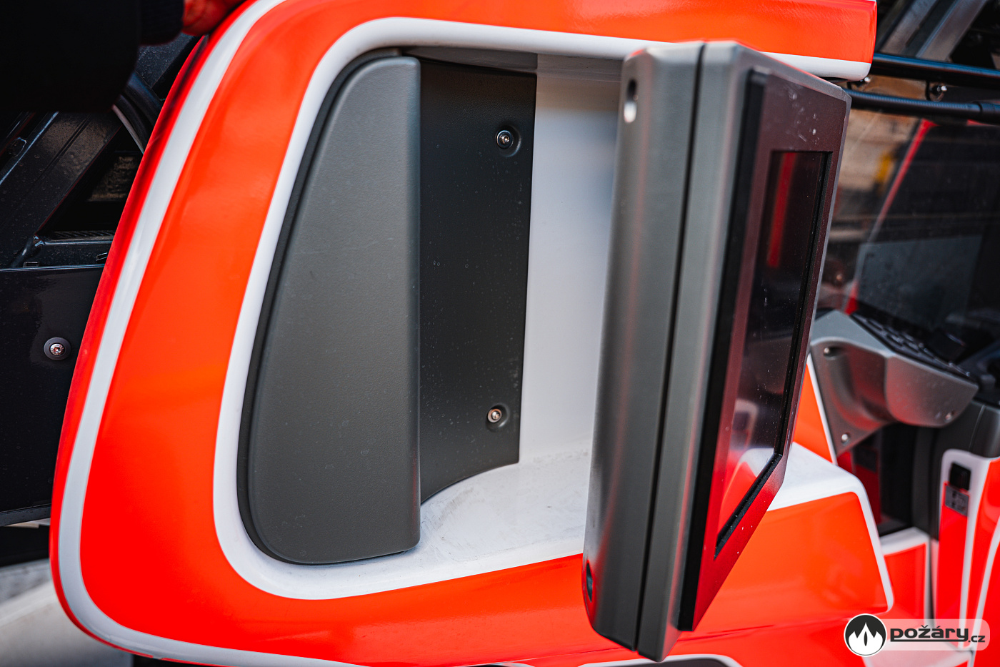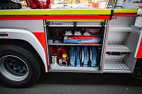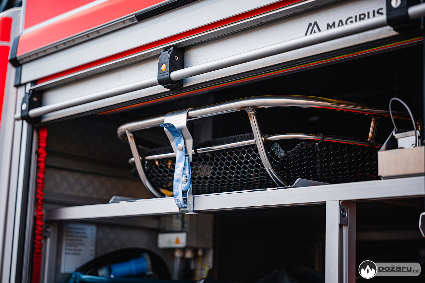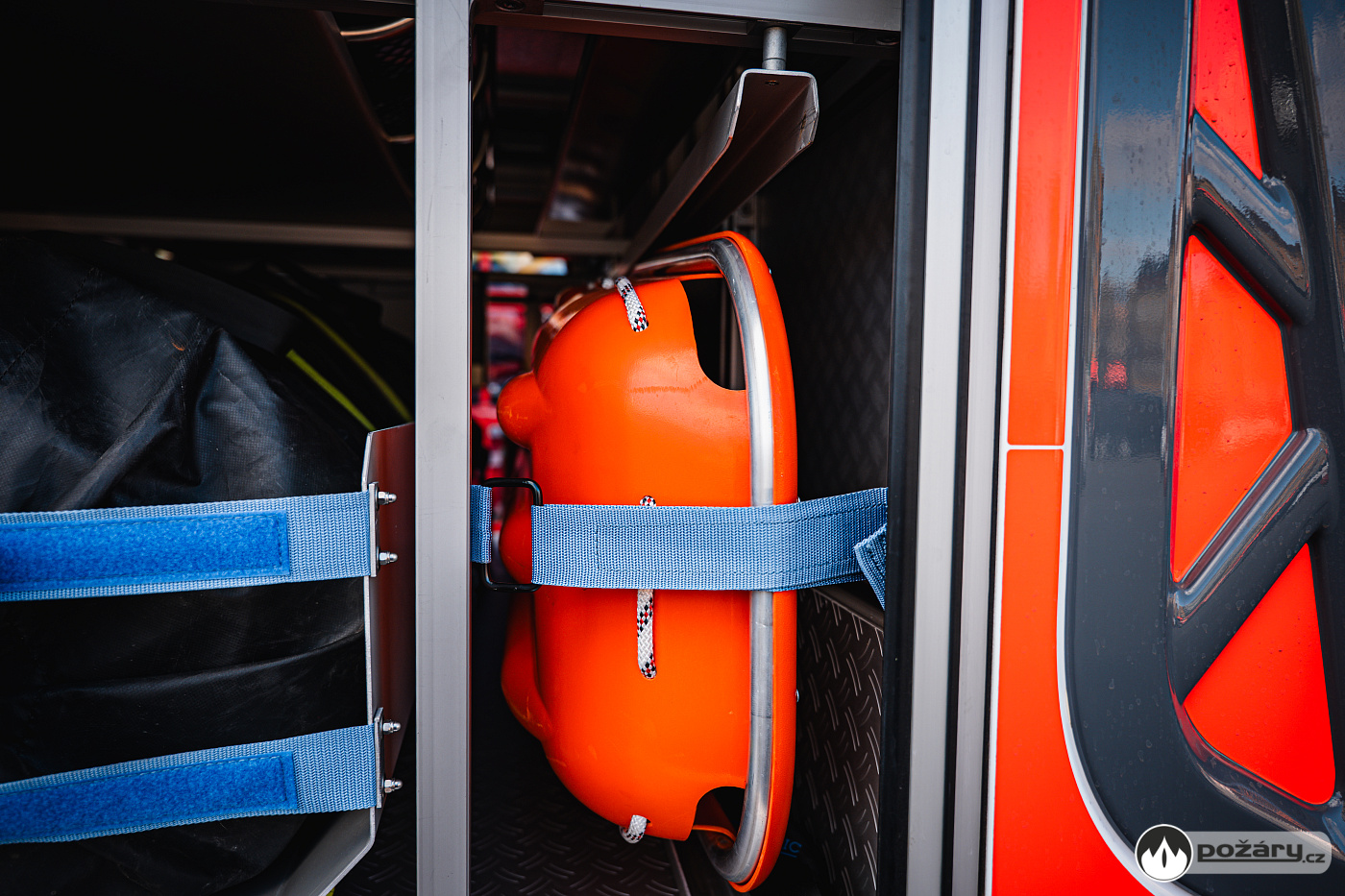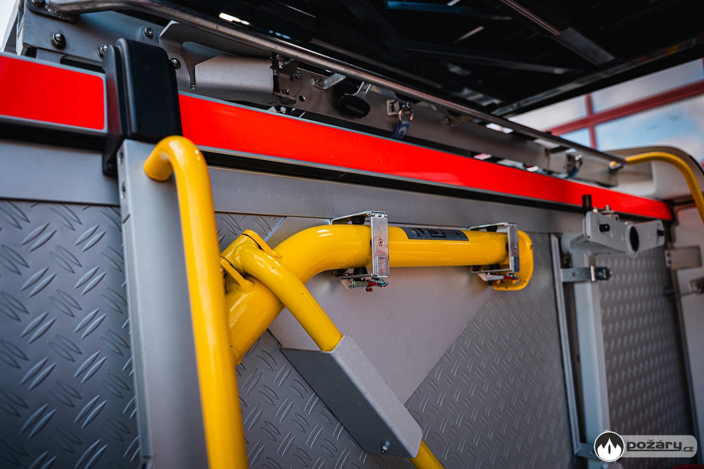 Úložné prostory a pochozí plocha jsou řešeny modulárním systémem Alu-Fire z hliníku. Na obou stranách vozidla najdeme dvojici skříní na vybavení, které uzavírají hliníkové roletky s průběžnými madly.