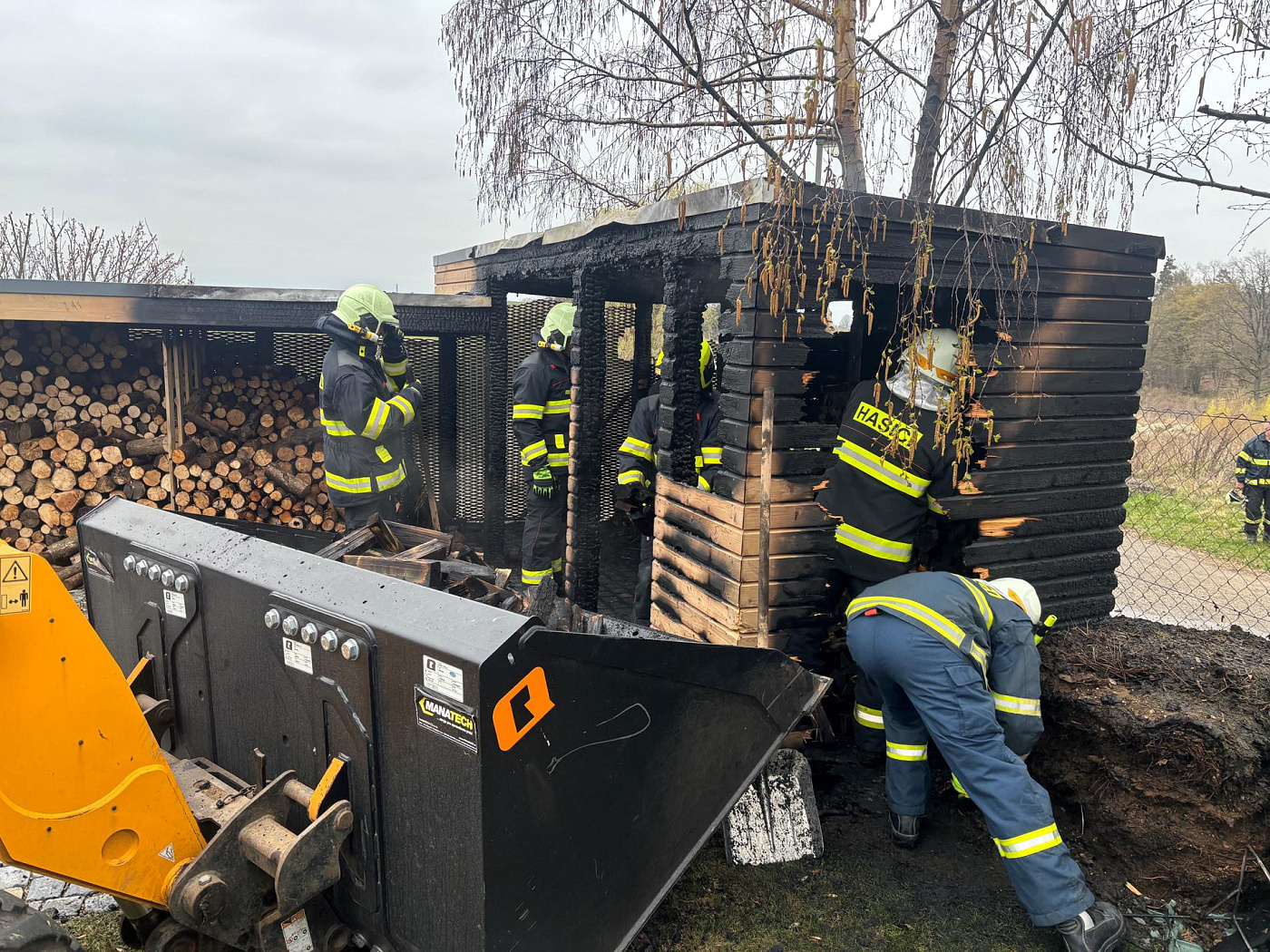 Po sedmi minutách od ohlášení hasiči zahájili zásah dvěma vysokotlakými proudy, kterými požár lokalizovali. Poté postupně vynášeli nezasažené dřevo, které odkládali na volný prostor. Shořelá polena přendávali do malého čelního nakladače k odvozu. Po vyskladnění a nahlášení likvidace požáru v 15.42 hodin ještě řetězovou motorovou pilou odřízli nejvíce poškozenou část konstrukce dřevníku, kterou pak nakladač strhl k zemi.