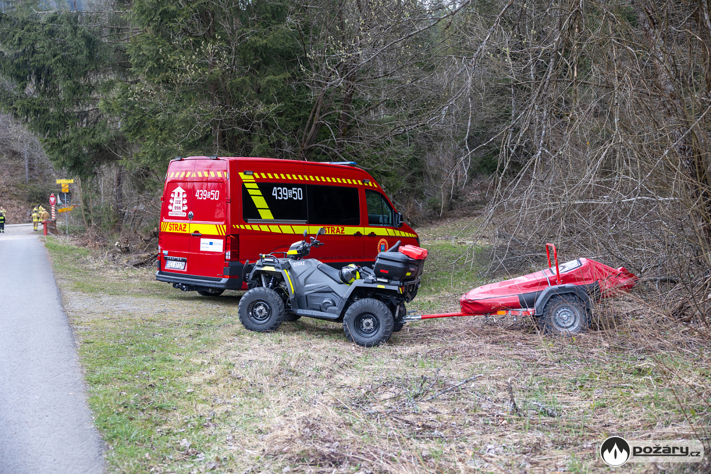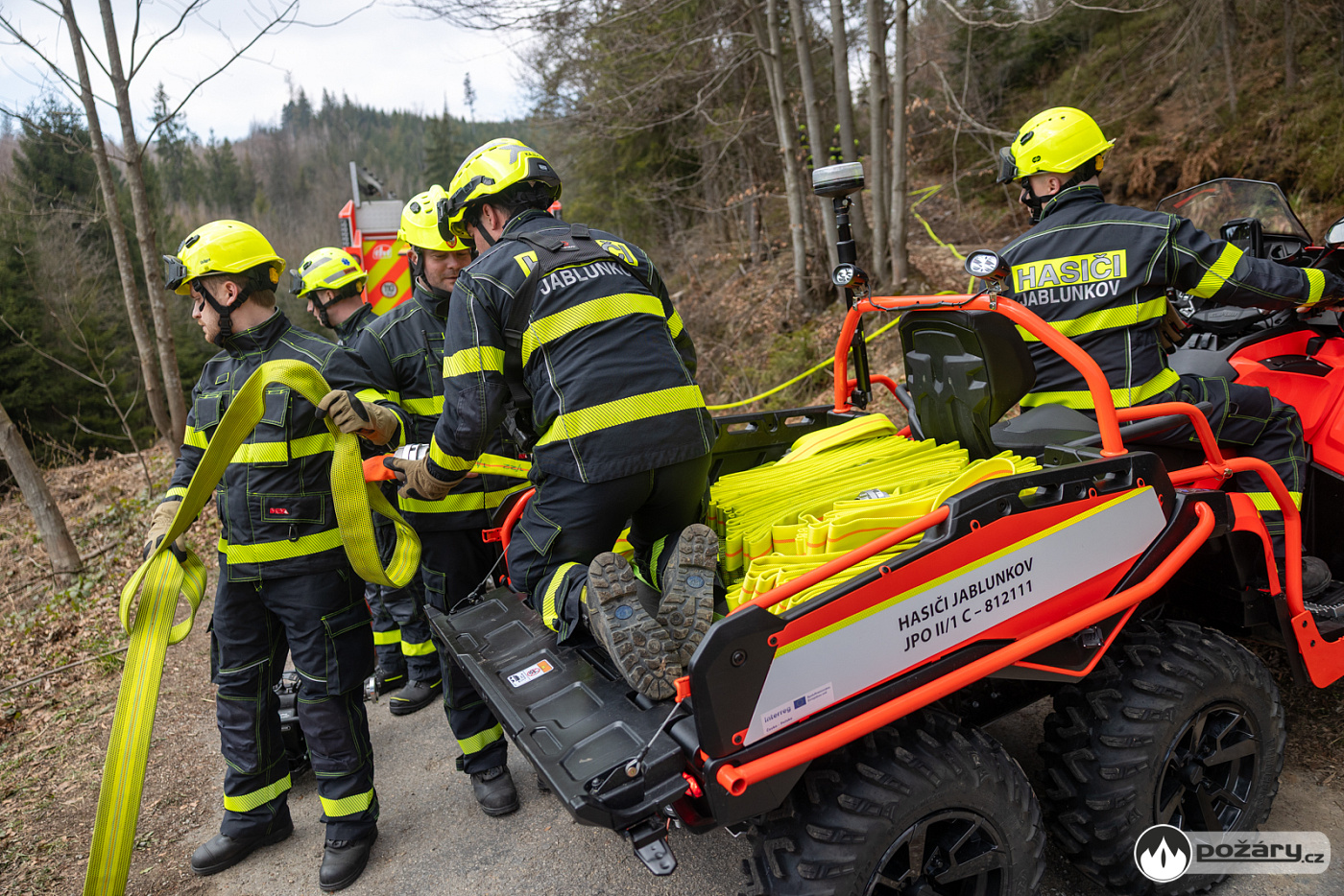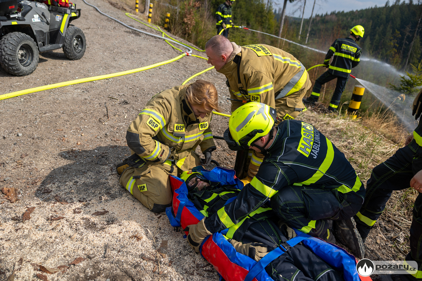 Součástí taktického cvičení bylo i využití další techniky, pořízené za podpory unijních financí – polští hasiči předvedli záchranu hasiče z terénu pomocí přívěsu své čtyřkolky.