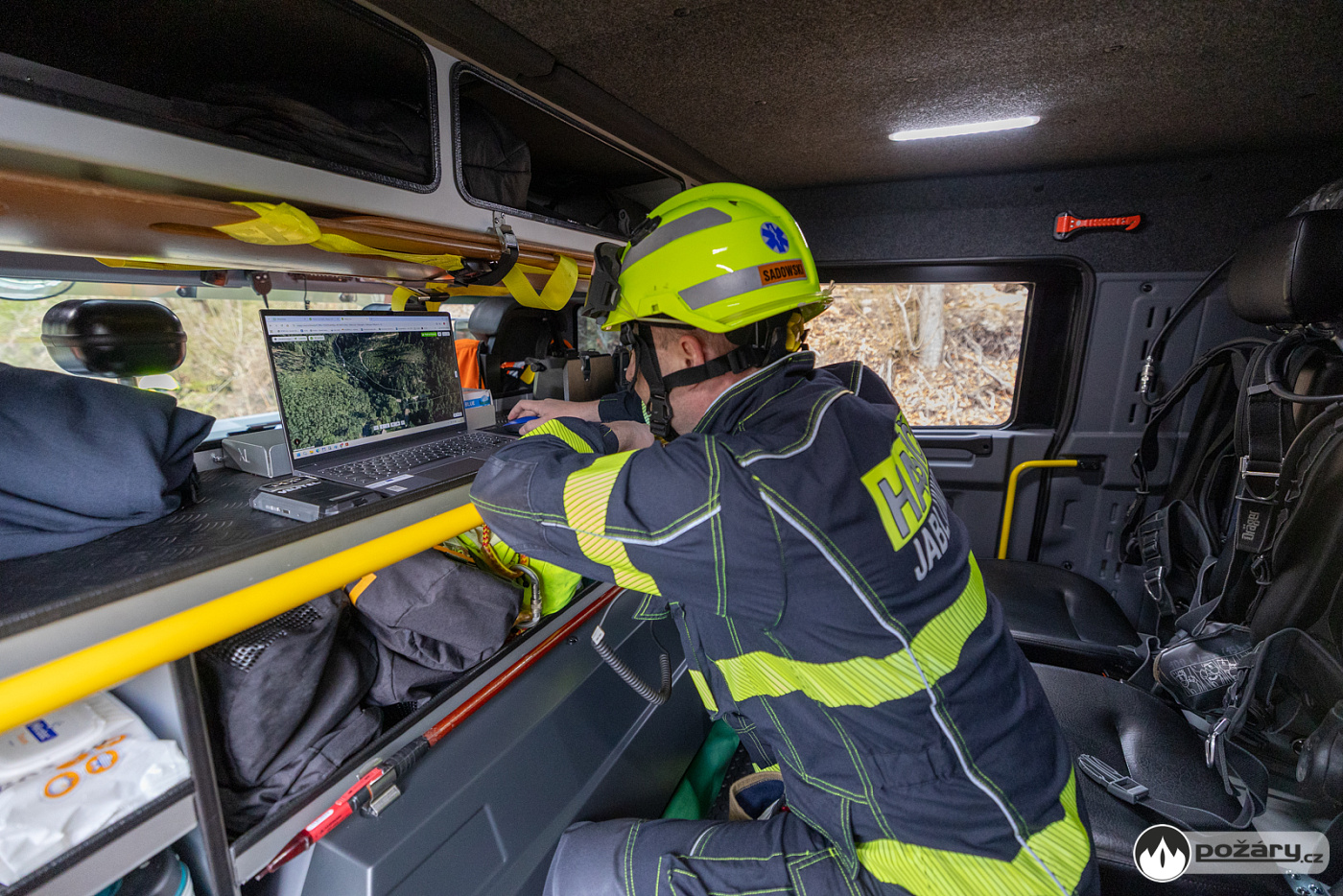 Průzkumné družstvo provedlo prvotní lokalizaci požáru, sdílelo v mobilní aplikaci trasu pro ostatní a zahájilo zásah pomocí zádových vaků a ručního nářadí.