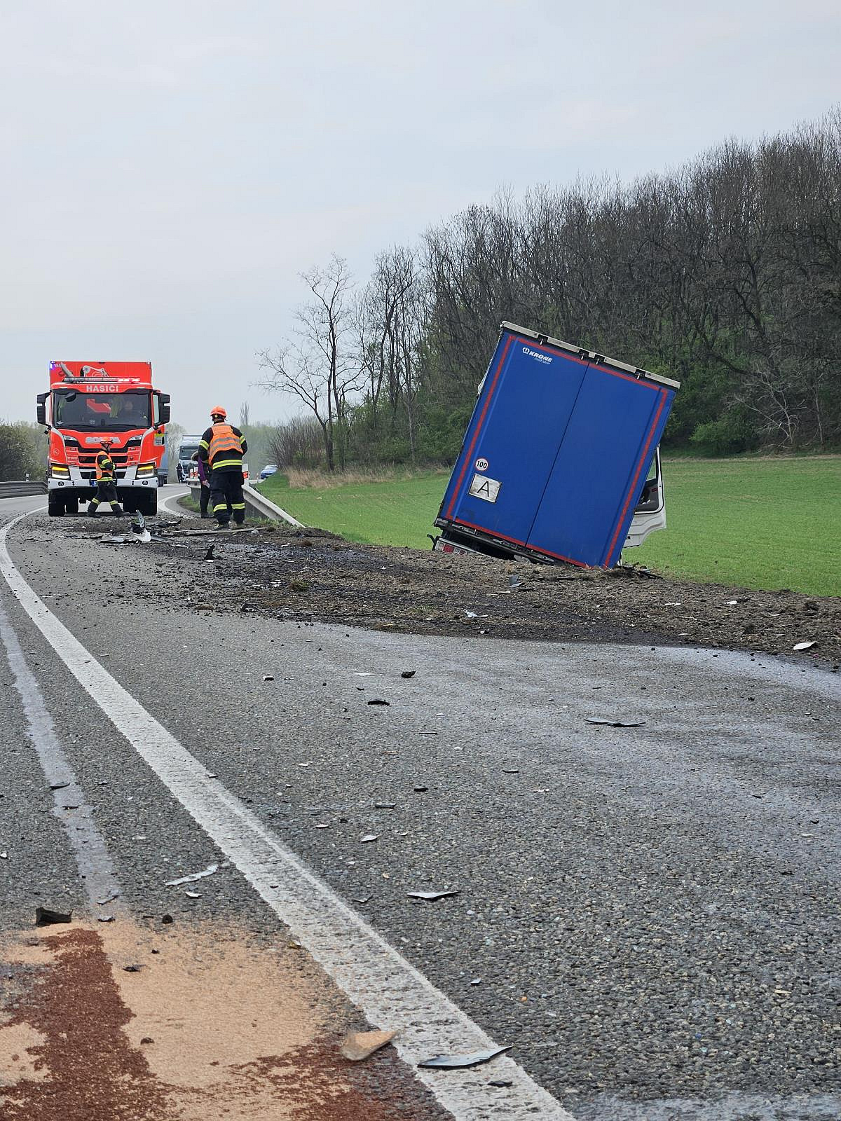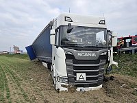 Silnice I/50 poblíž Bučovic byla po nehodě osobního vozidla a kamionu několik hodin neprůjezdná