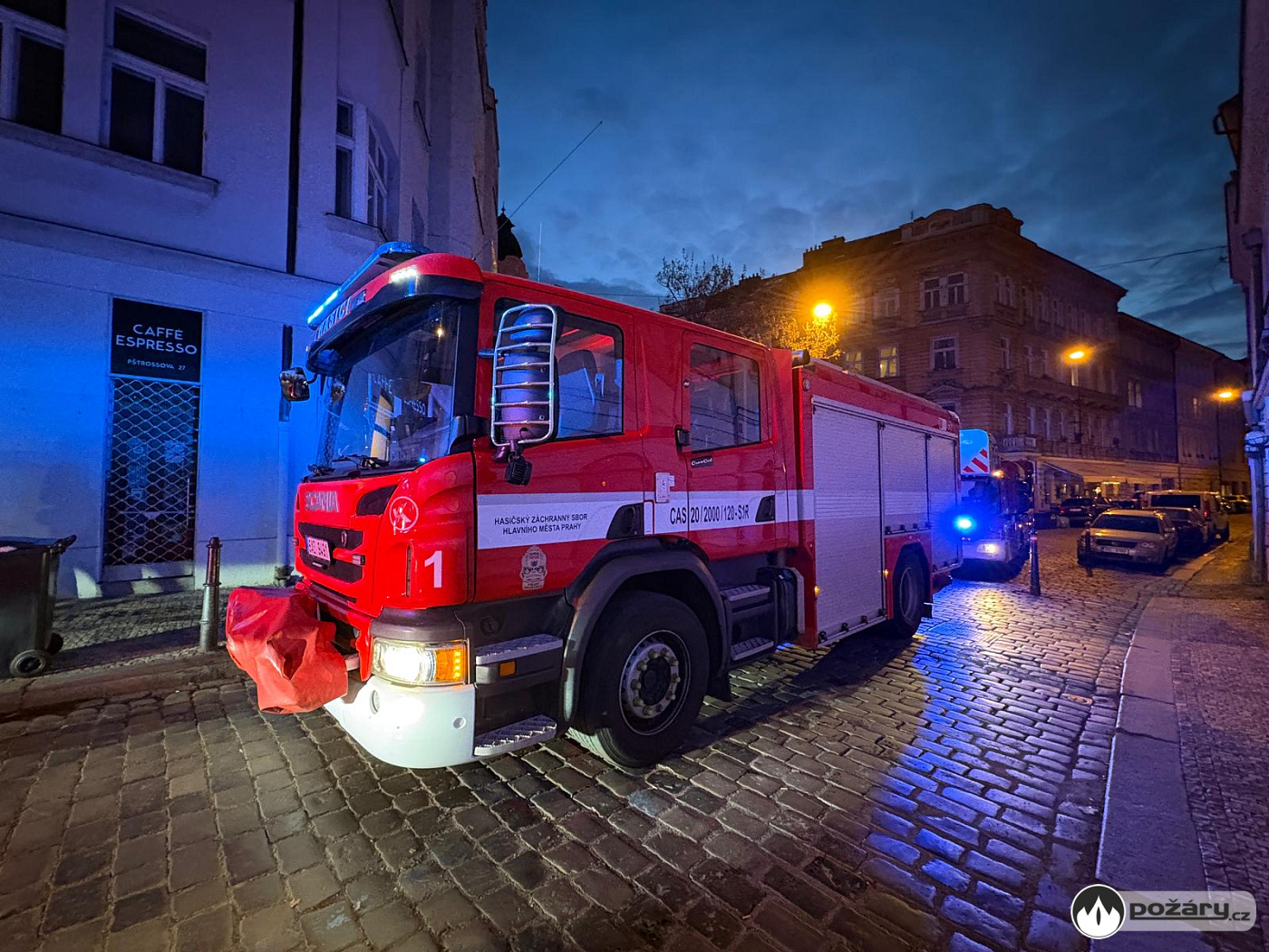 Profesionální hasiči ze tří pražských stanic vyjeli do ulice Pštrosova na Praze 1 k ohlášenému požáru vybavení kuchyně. Požár byl uhašen v dýchací technice jedním vodním proudem.