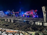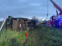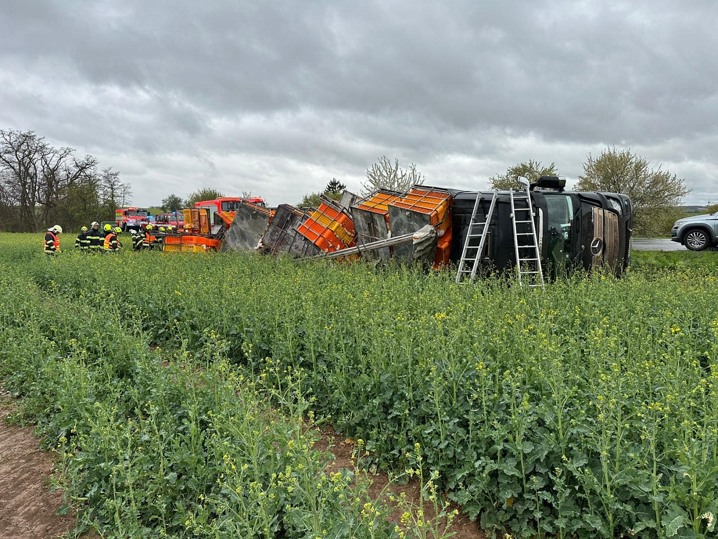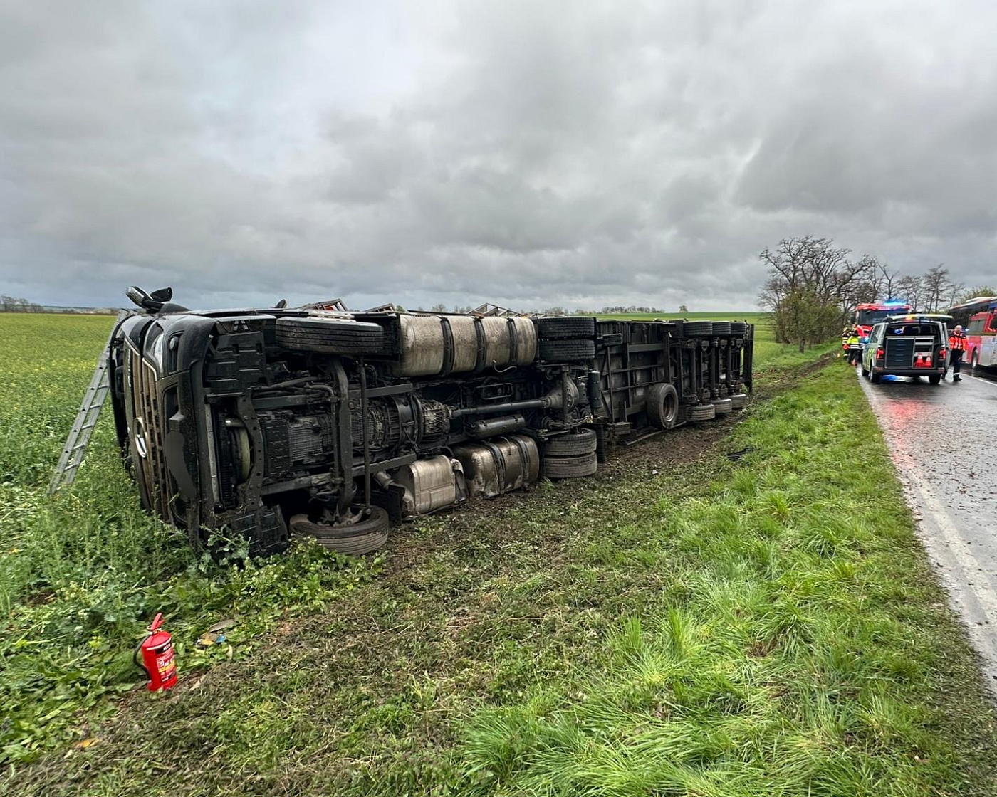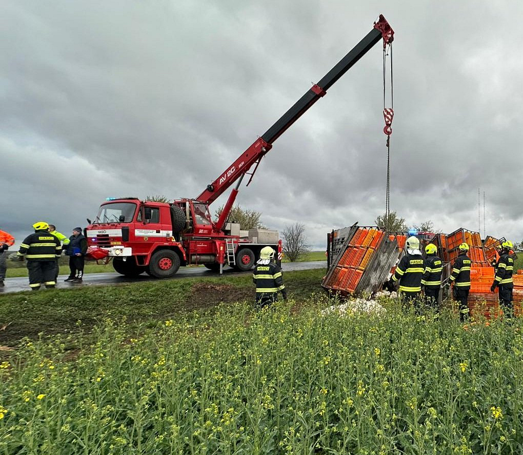 Nákladní vozidlo převážející 5000 slepic skončilo u obce Kšely převrácené mimo komunikaci