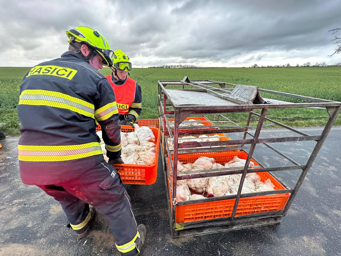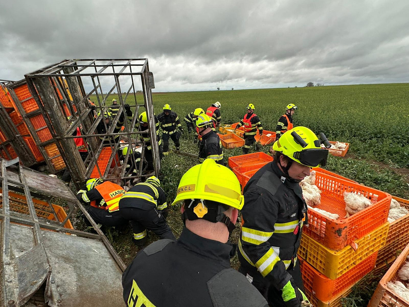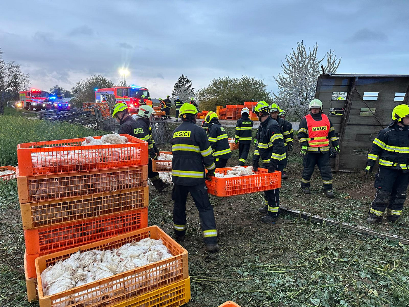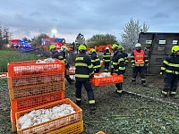 Po příjezdu první jednotky na místo bylo provedeným průzkumem zjištěno, že vozidlo převážející 5000 slepic skončilo převrácené mimo komunikaci a je nutné vyprostit řidiče. Ten byl následně vyproštěn a převzala si ho do péče zdravotnická záchranná služba.