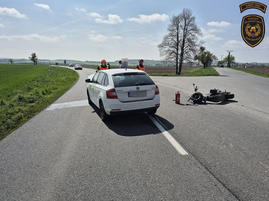 K dopravní nehodě, která se stala na křižovatce u Třebětic ve směru na Ludslavice a Zahnašovice, vyjeli profesionální hasiči z Holešova. Na místě došlo ke střetu osobního automobilu s jednostopým dopravním prostředkem, na němž cestovaly dvě osoby.