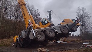 V Radošově na Karlovarsku hrozilo převrácení autojeřábu, obsluhu se podařilo vyprostit až po vypnutí elektrického proudu